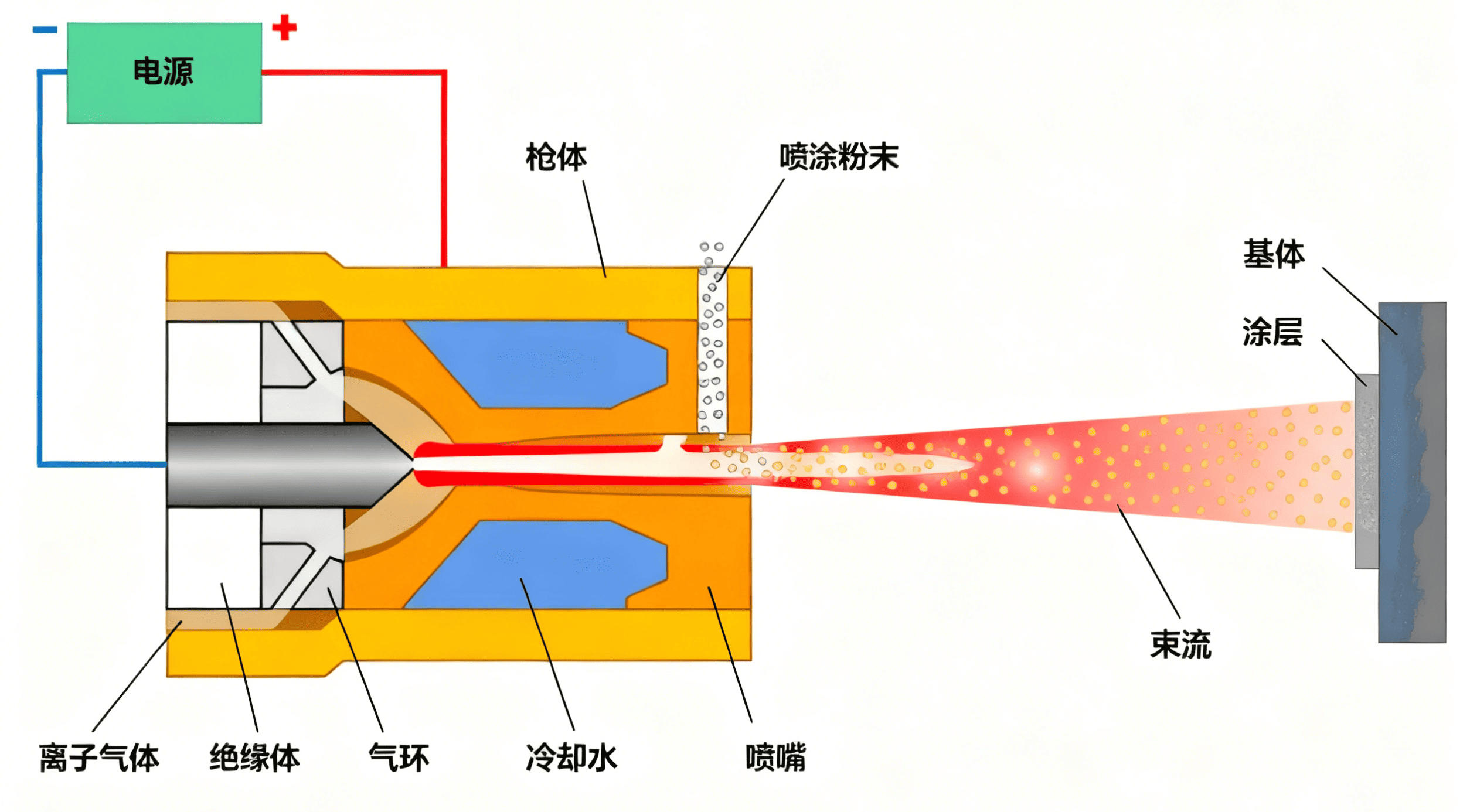 超高速等离子热喷涂是利用超音速非转移型等离子弧为热源,来加热粉末喷涂材料至熔融或半熔融状态,再经加速后高速撞击经过预处理的基材表面形成涂覆层的工艺方法。超高速等离子喷涂兼具普通等离子的 “高温” 和超音速火焰喷涂 “高速” 的双特性,等离子弧长度是普通等离子的 2 倍以上。